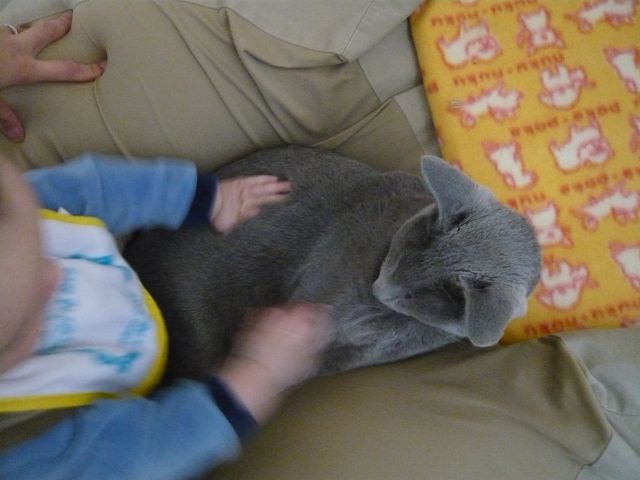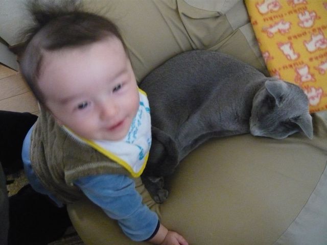 しばらくおとなしく触らせておいてくれて、隙をみてコソっと逃げていきます。 赤ん坊を怖がってるわけではないようで、時々遊んでるジョシュアの近くに寄ってきてニオイを嗅いだりはするんだけど、やっぱり直接手は出さない。 あちこちに転がってるジョシュアのオモチャ・・・間違いなくSmokeyが遊びたい形状のハズなのに、これも手を出さない。