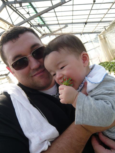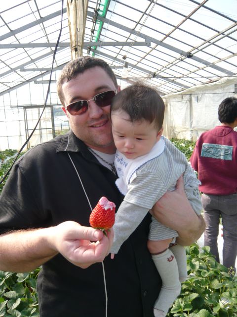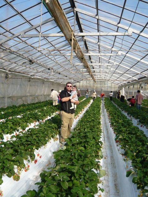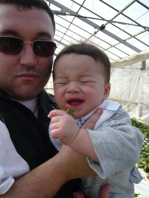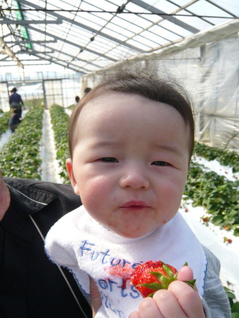 ベビーカーでも入れるハウスもあるんだけど、ちょっと着いたタイミングが悪くて案内されたのは屈んでイチゴを摘まなくてはいけないタイプでした。 でも「ちょうどさっき開けたとこだから」って言われれば、こっちに熟れ熟れが待ち構えてるって事じゃない? ジョシュアぐらい抱いて参戦しますわさ。